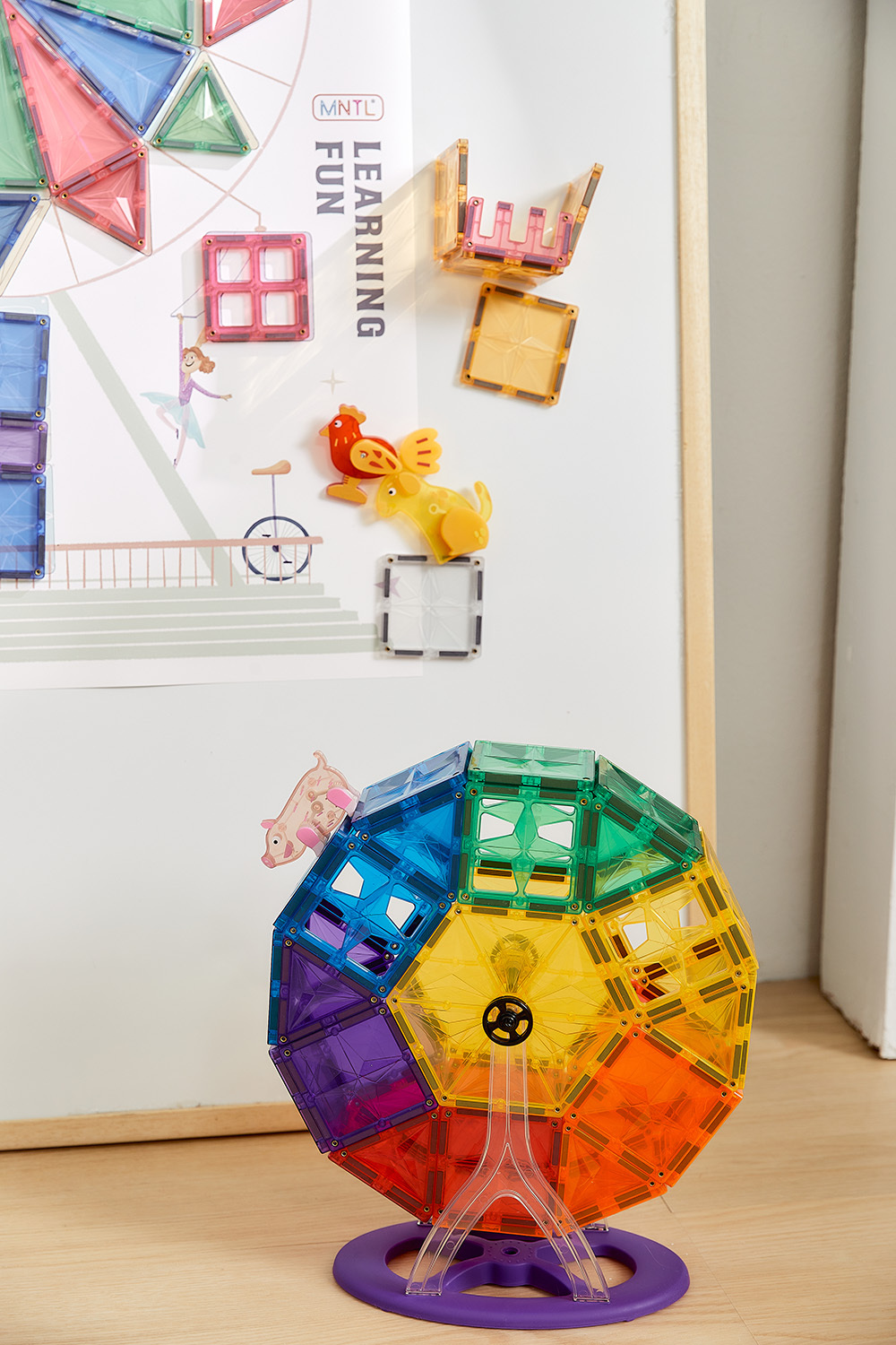 摩天輪特別組合,附支架與轉軸,第一次接觸磁力片與開放式玩法的新手,也能輕易地完成作品喔!組合內有少見的六角形及鏤空芒星造型磁力片,除了摩天輪造型,也試著玩出不同變化吧。